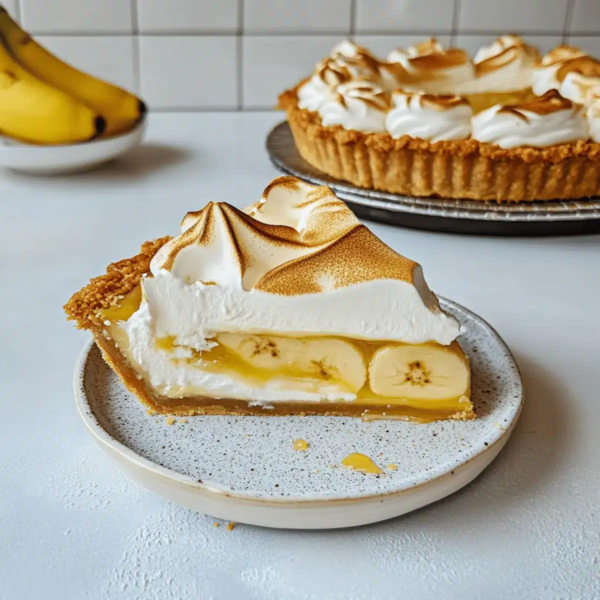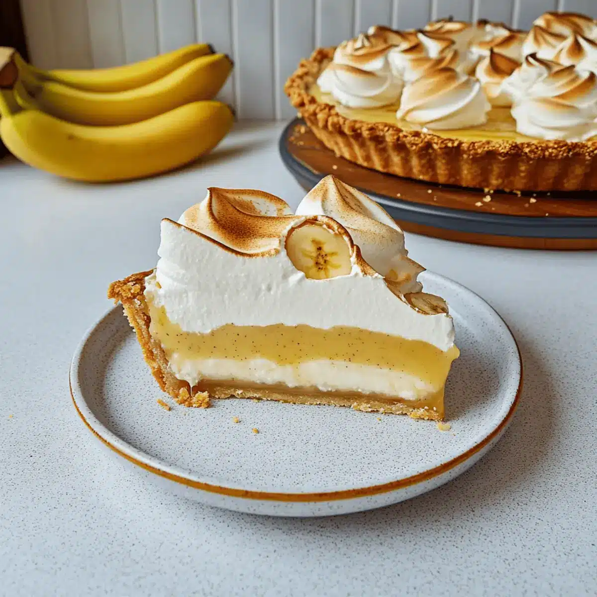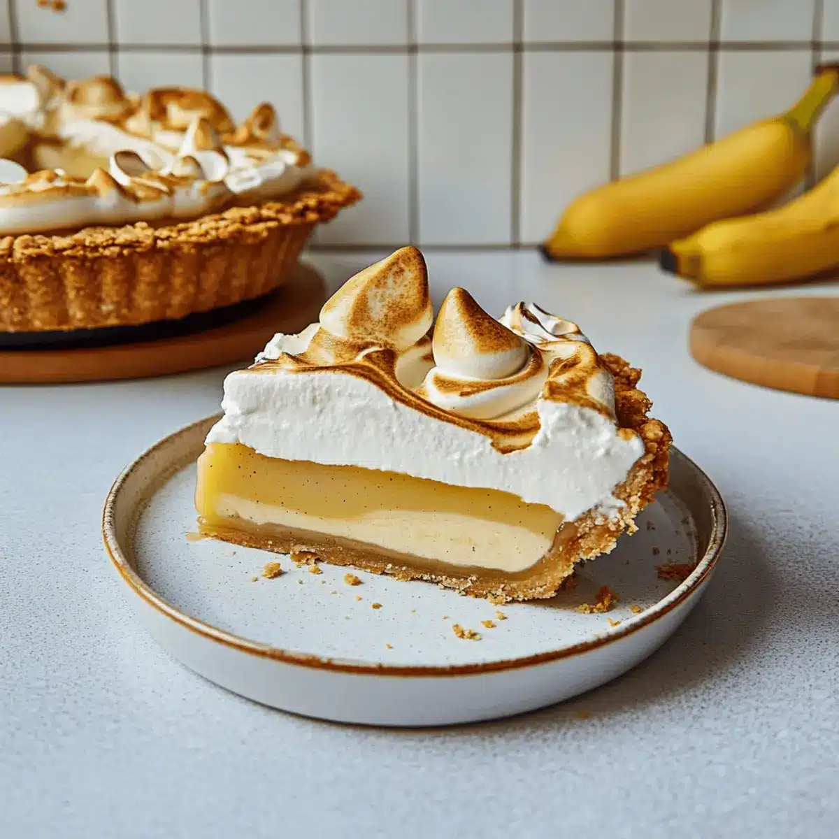 - Pour the banana filling into the cooled pie crust, smooth the top, then spoon the meringue over, creating peaks.
