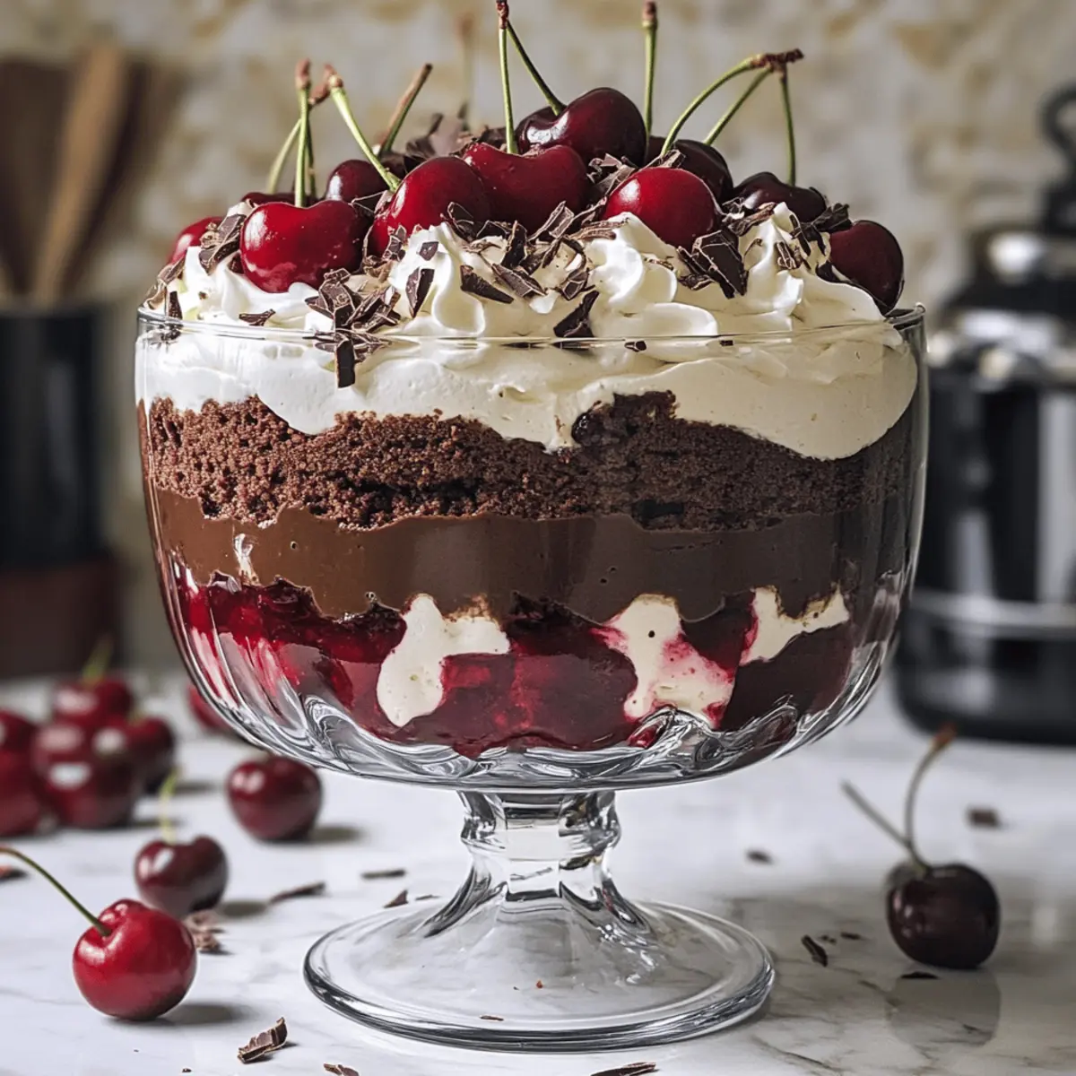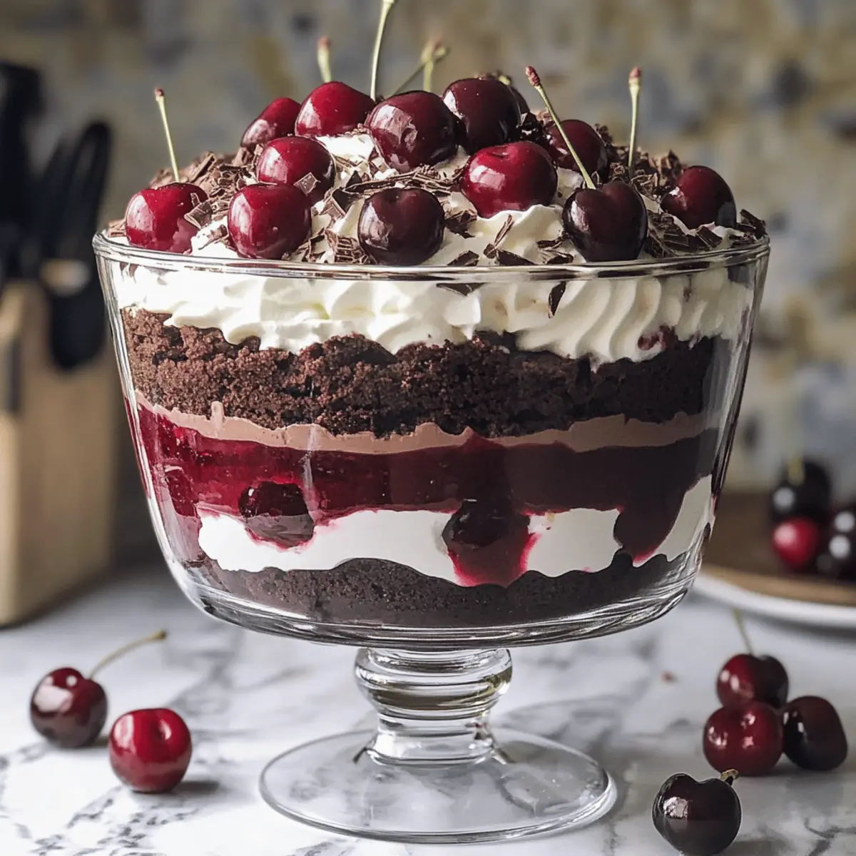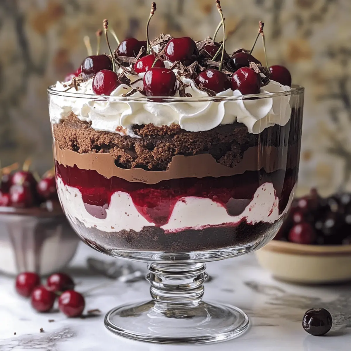 Decadent Layers: The Black Forest Trifle features rich layers of chocolate cake, creamy pudding, and tart cherry pie filling, creating a deliciously indulgent dessert.