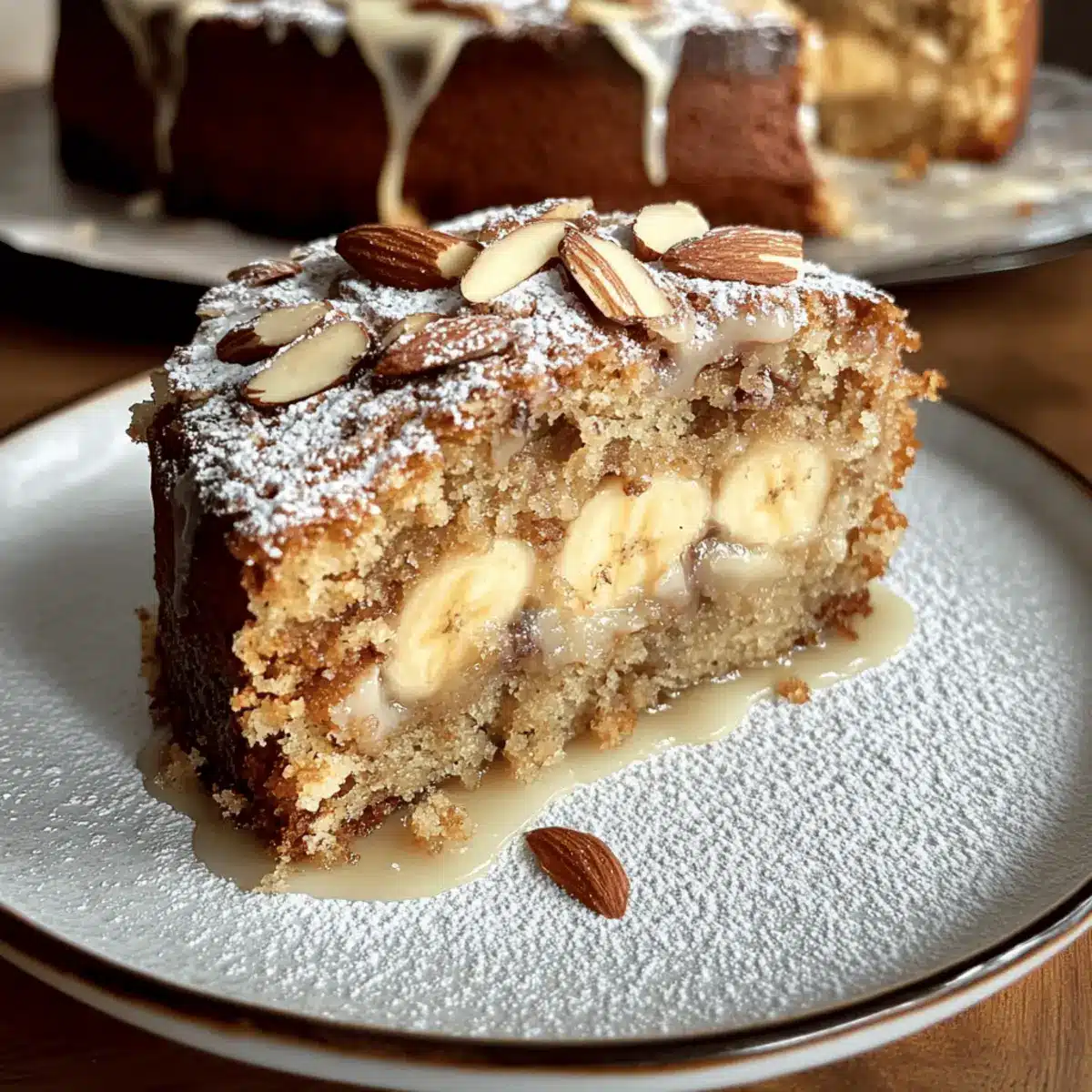Once baked, remove the cake from the oven and let it cool in the pan for about 10 minutes. Then, transfer it to a wire rack to cool completely. Drizzle with a simple vanilla glaze and dust with powdered sugar before topping with the toasted almonds for an elegant finish to your Brown Butter Almond Croissant Banana Cake.