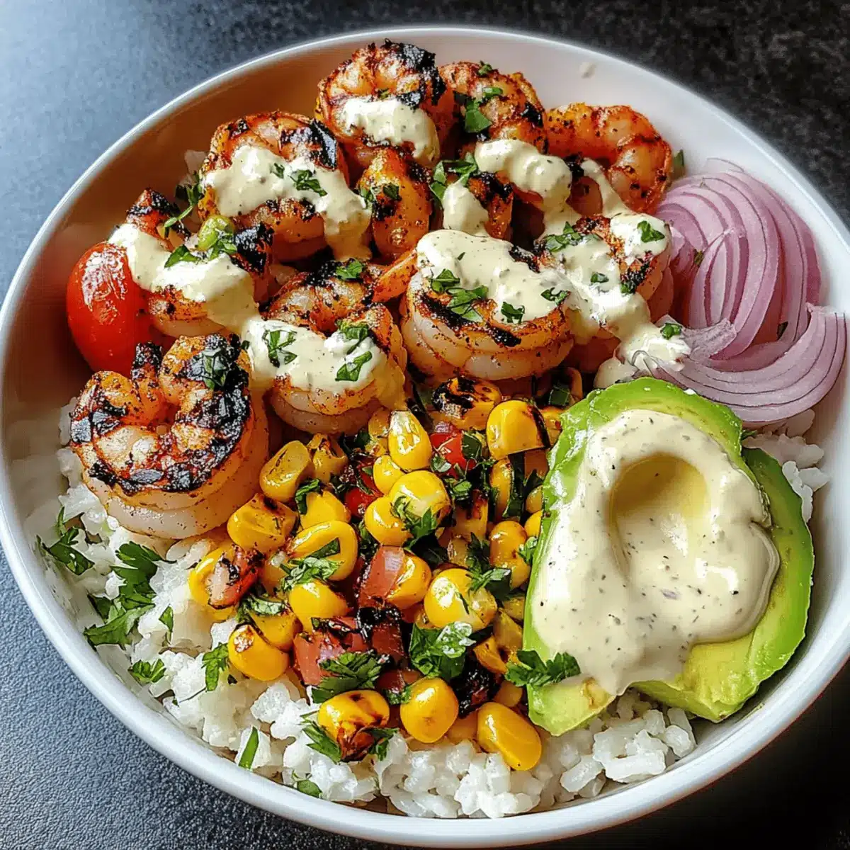 Grilled Shrimp Bowl with Avocado, Corn Salsa & Creamy Sauce Bliss