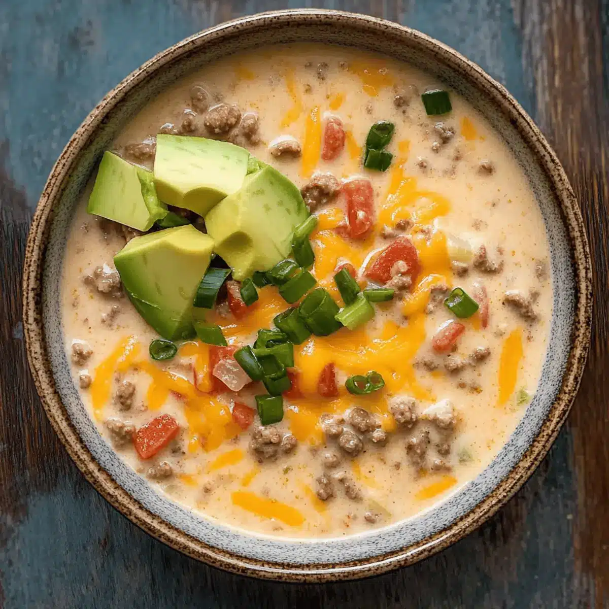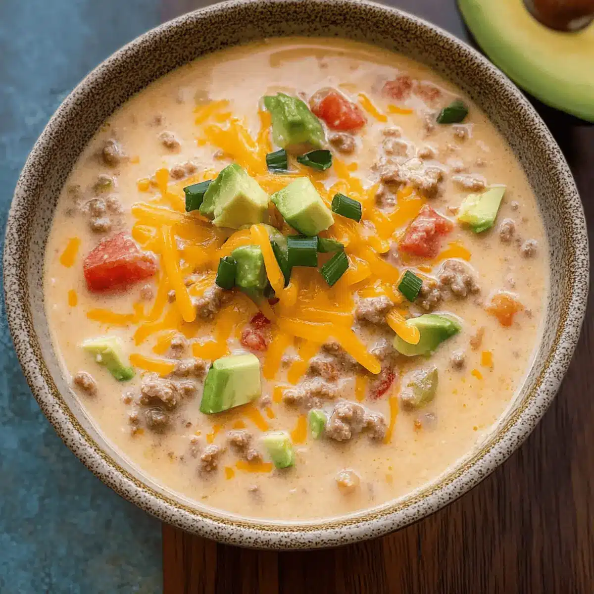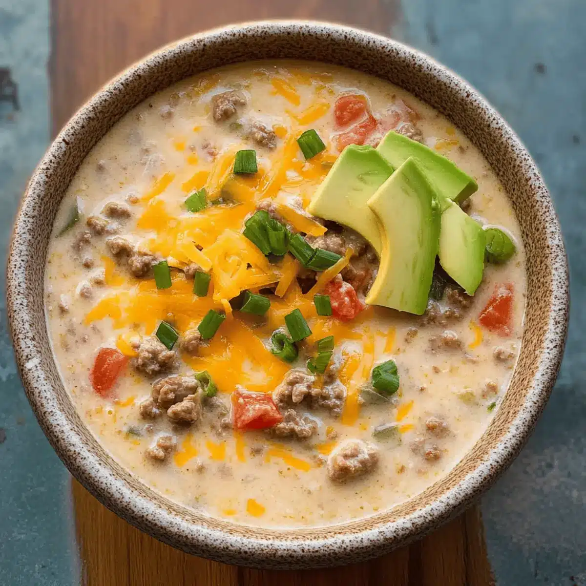Ladle the steaming Cheesy Beef Soup into bowls. For a delightful finishing touch, garnish with more shredded cheese, diced fresh tomatoes, sliced green onions, or creamy avocado. Serve immediately alongside your favorite keto-friendly chips or veggies to complete a hearty meal that everyone will enjoy.