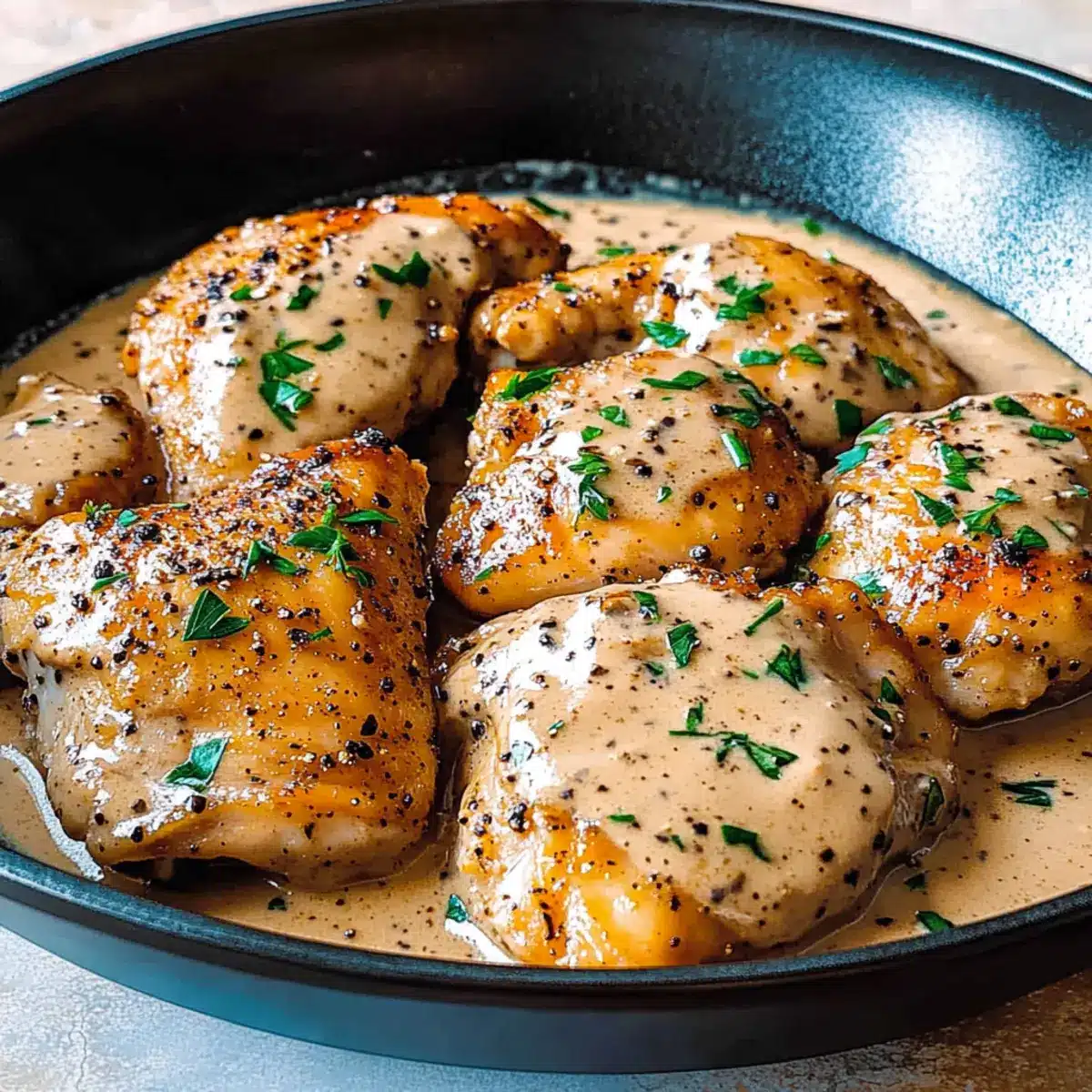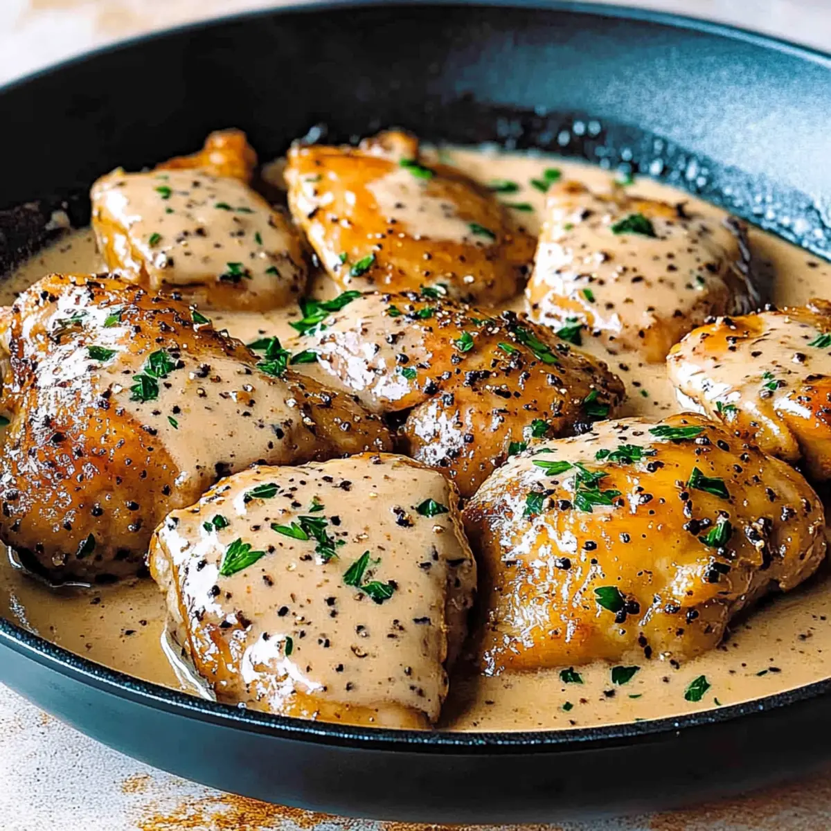 - Once your Chicken au Poivre is ready, plate the chicken and spoon the creamy sauce over each thigh. Garnish with chopped parsley.