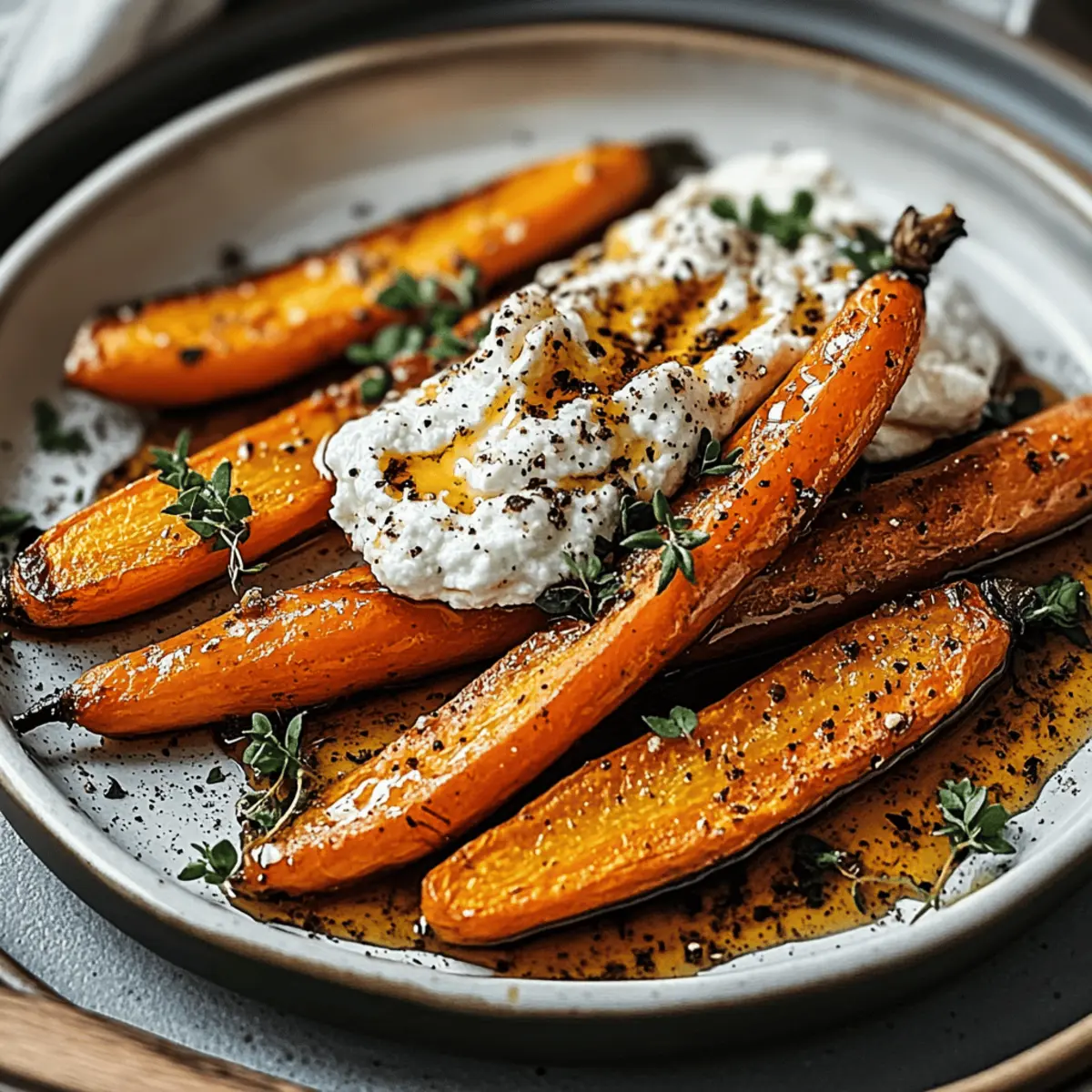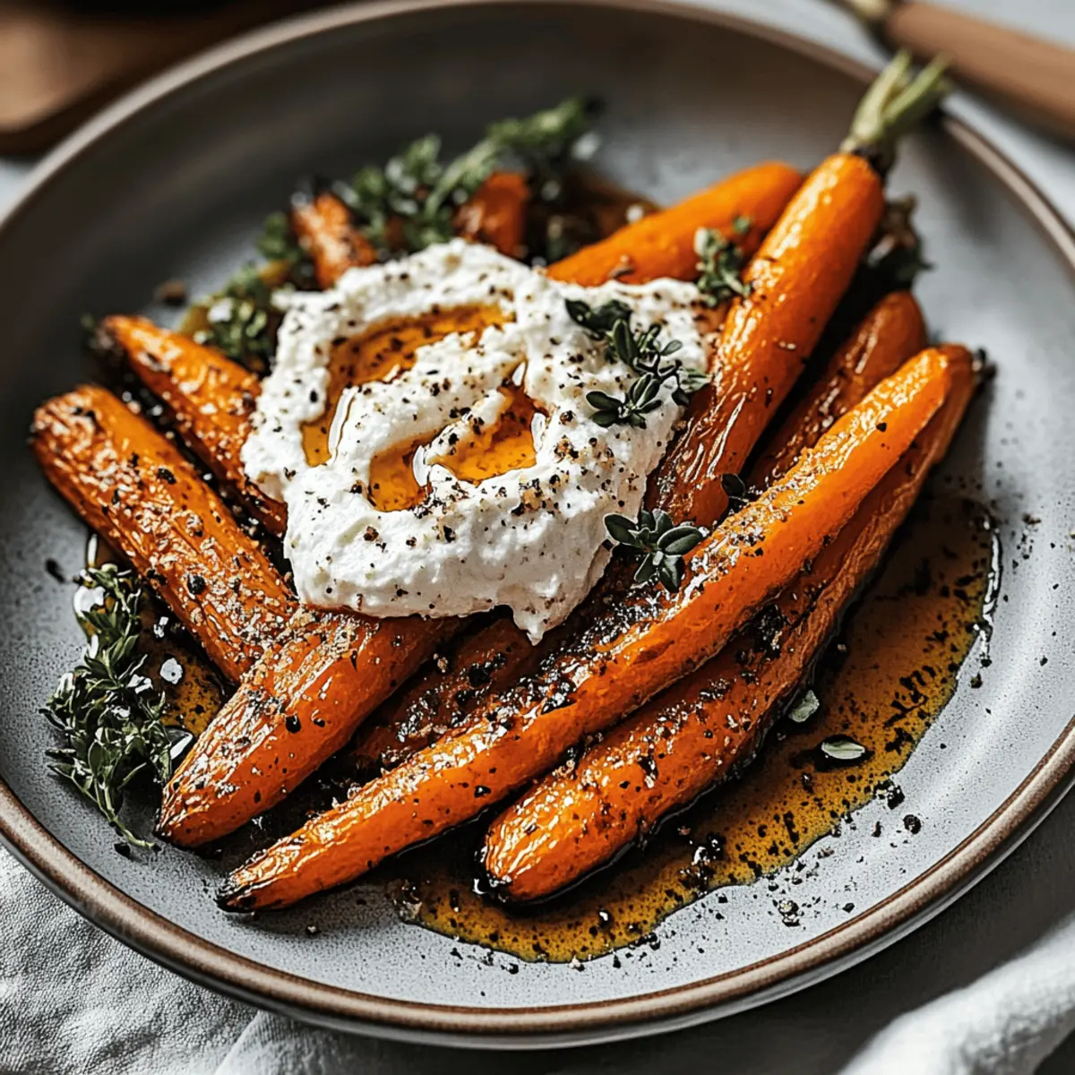Once the carrots are perfectly roasted, transfer them to a serving plate. Generously dollop the whipped ricotta over the top, allowing it to cascade down the sides. Drizzle your spicy honey mixture artfully over the dish, and finish it off with a sprinkle of fresh herbs like thyme or parsley for a vibrant presentation.