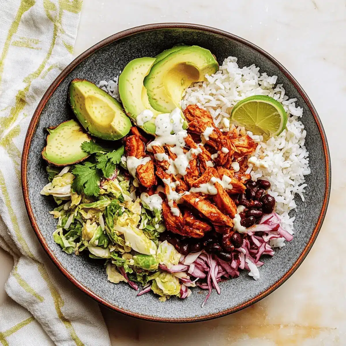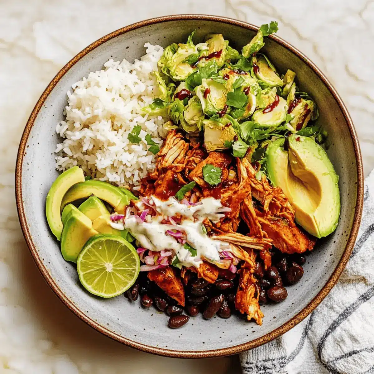 To assemble the Sweet and Spicy Chicken Bowl, spoon cooked white rice into serving bowls. Top each bowl with generous portions of the shredded chicken and a heaping scoop of the zesty Brussels sprout slaw. Garnish with fresh radishes, sliced avocado, and lime wedges for an extra burst of flavor.