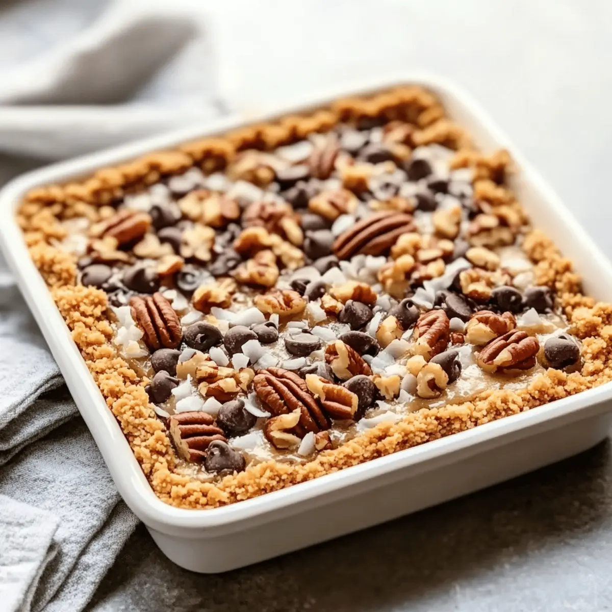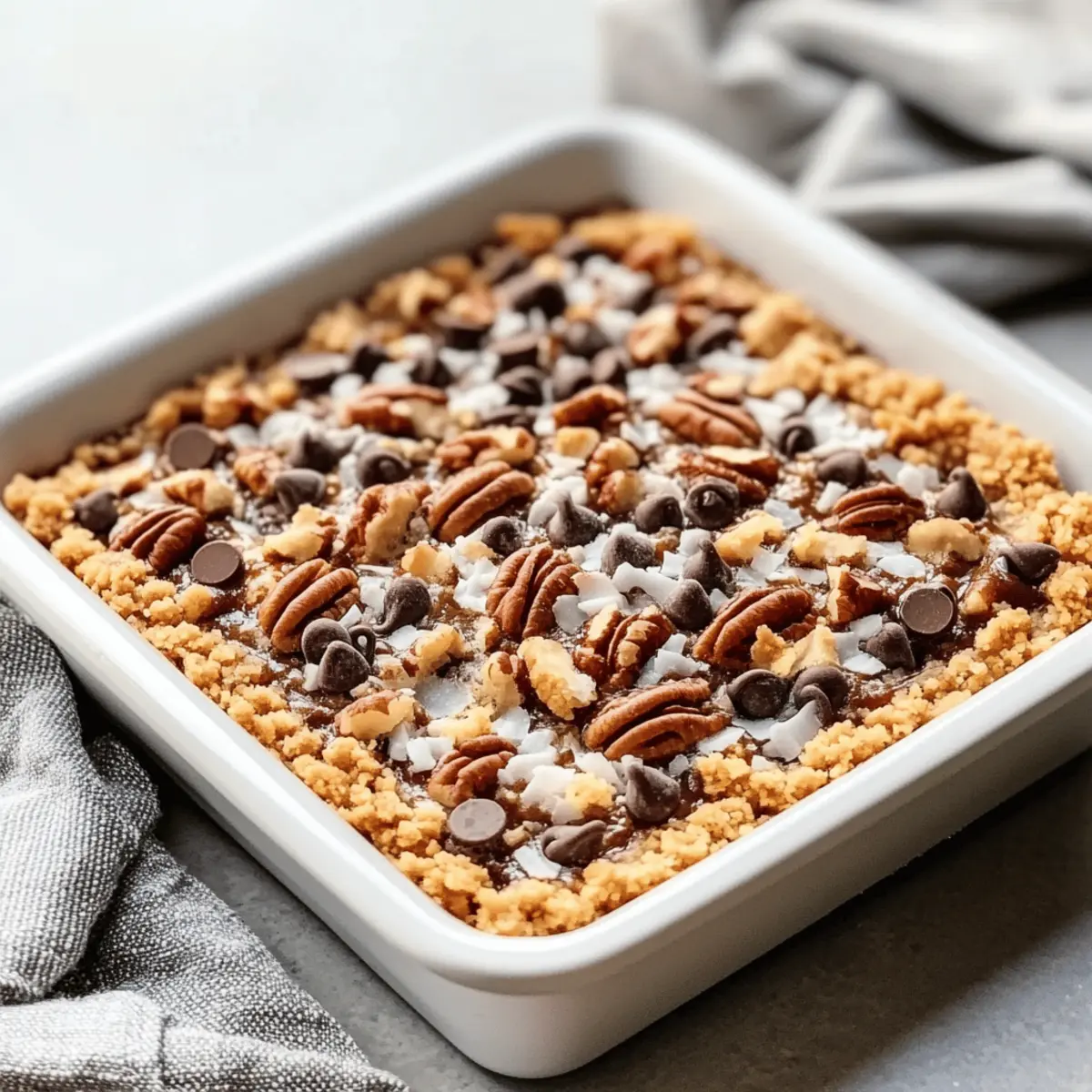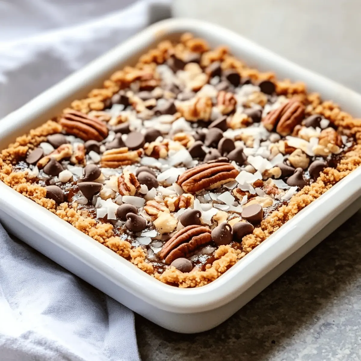 - Once the crust has cooled slightly, sprinkle sweetened coconut over the crust, followed by chocolate chips and chopped pecans.